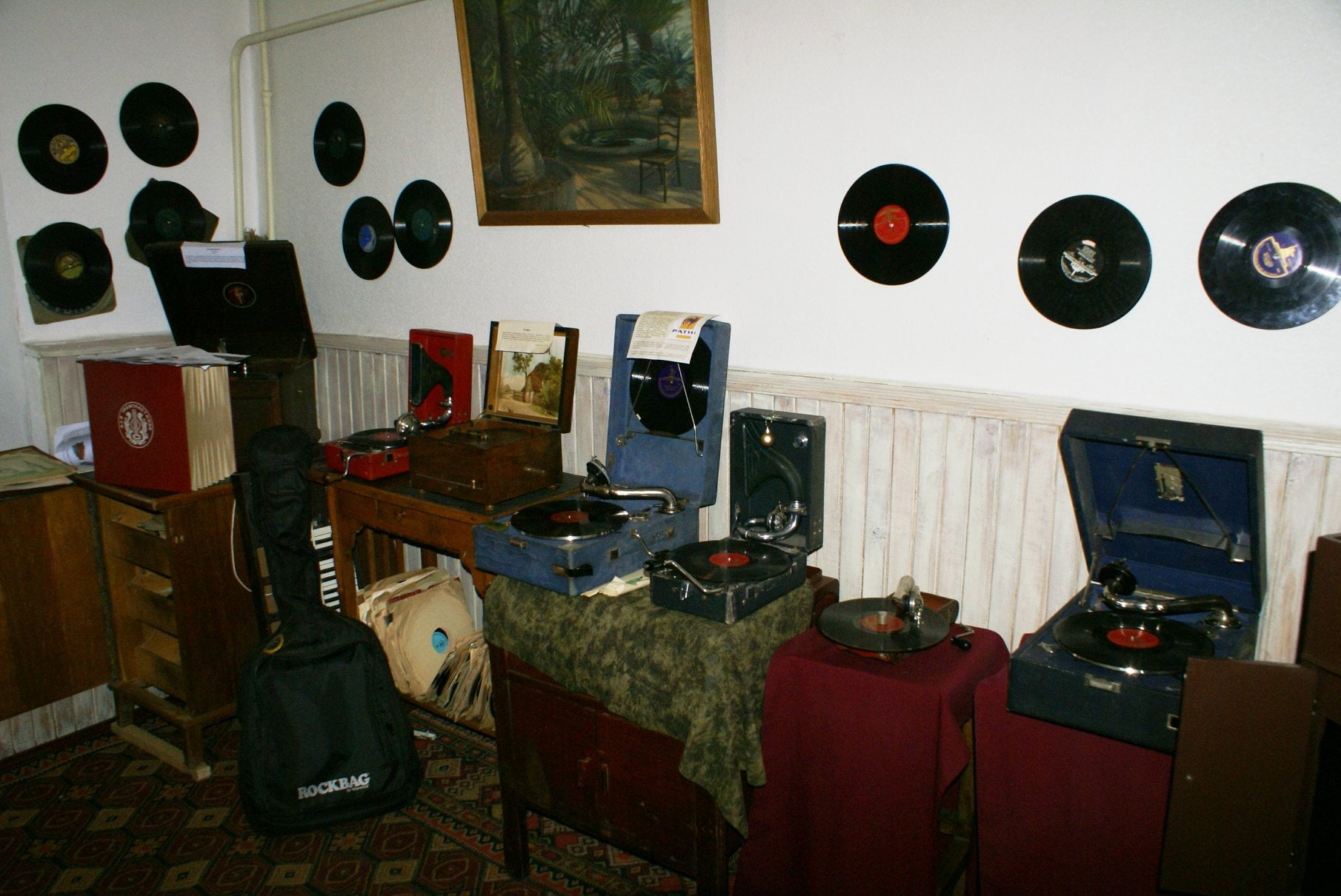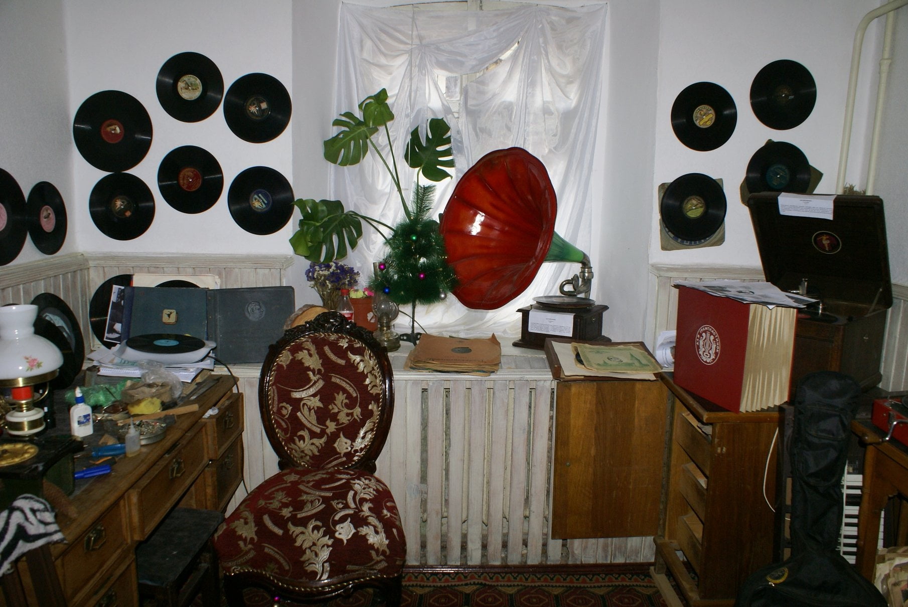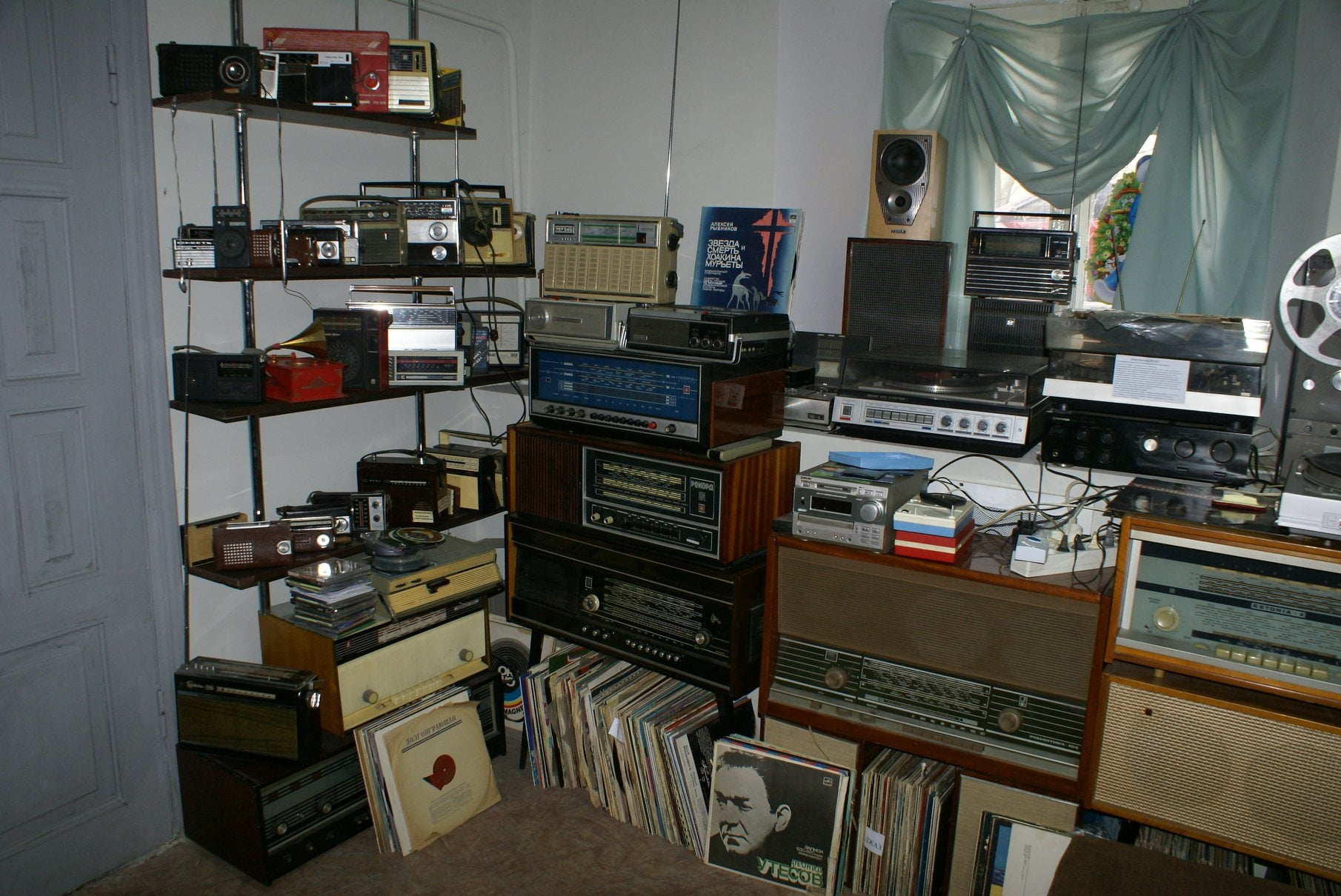 - велика колекція вінілових платівок, бабін і касет.