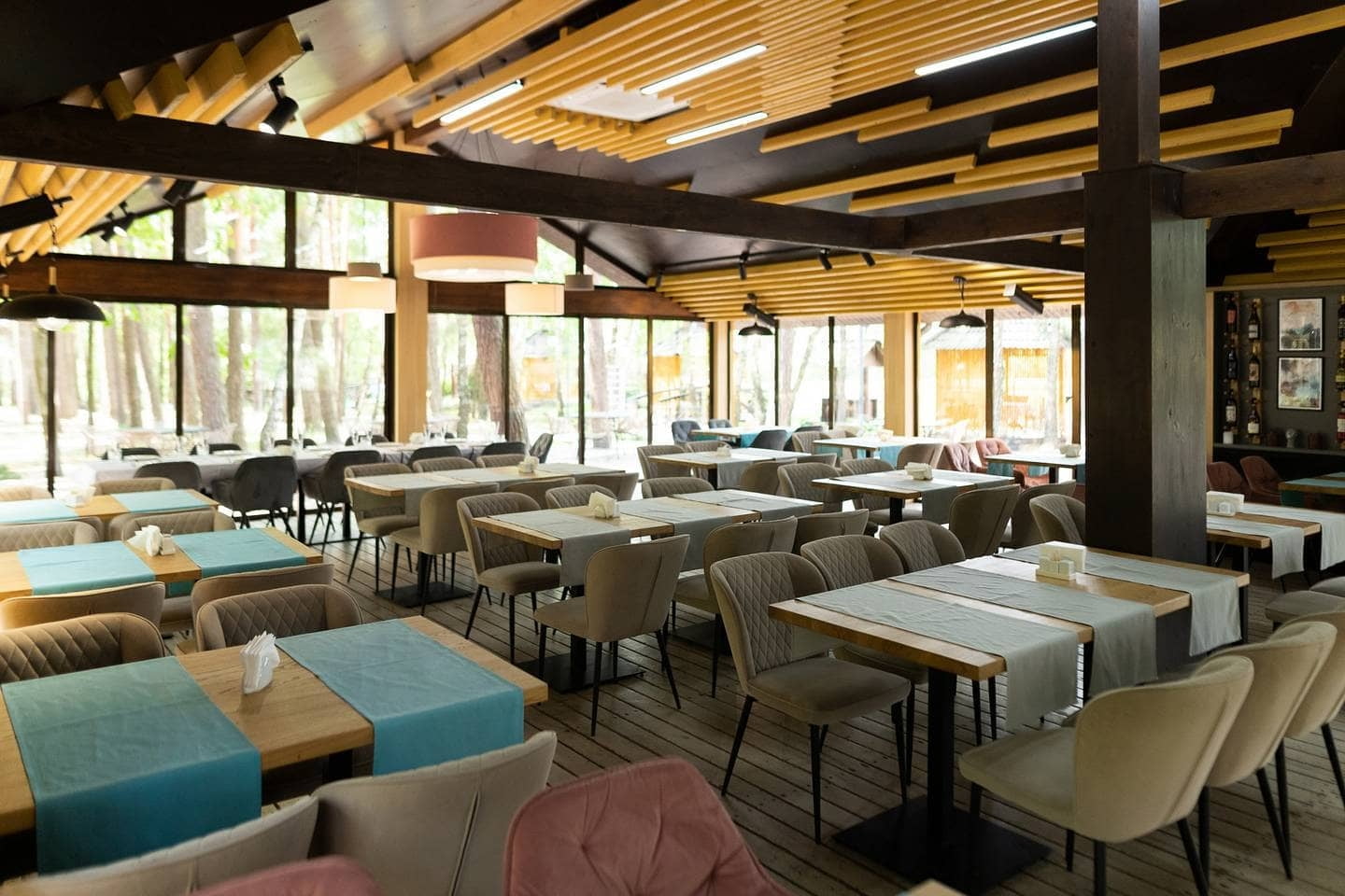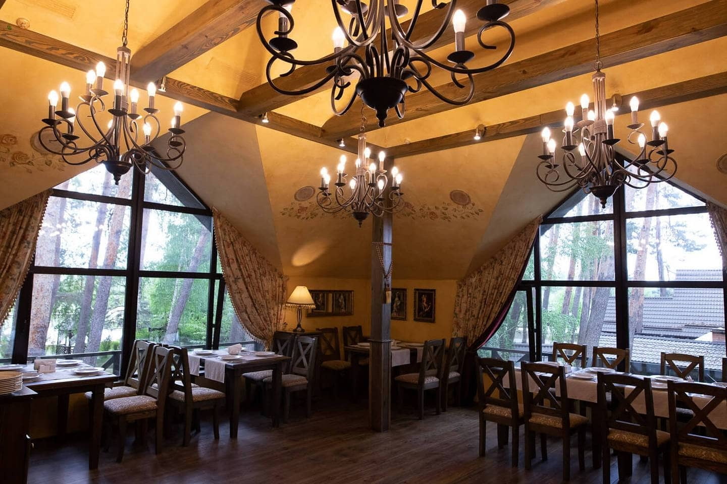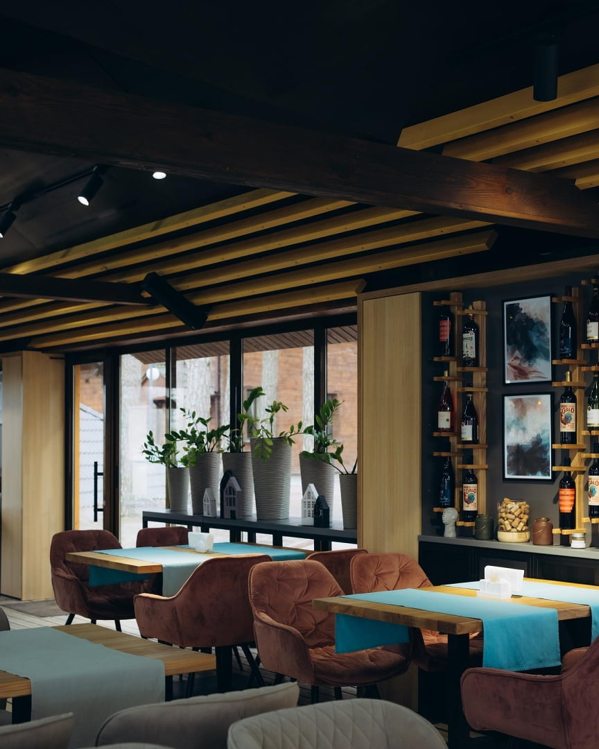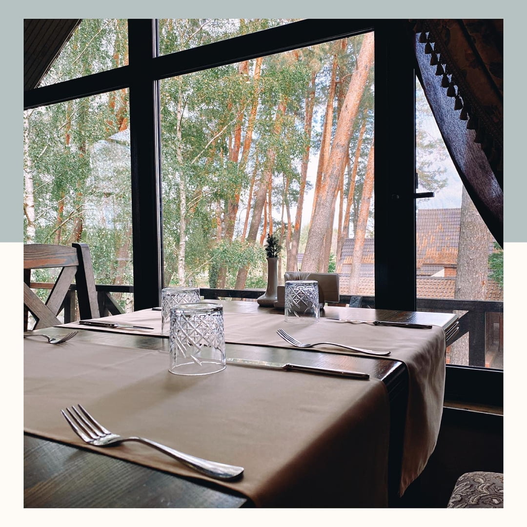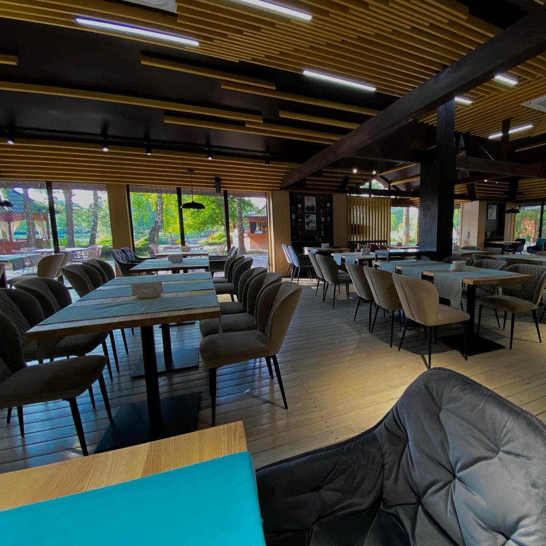 | Кухня | ресторани європейської кухні з поліськими акцентами, банкетні зали, жива музика, панорамний ресторан, колиби, альтанки біля озера |