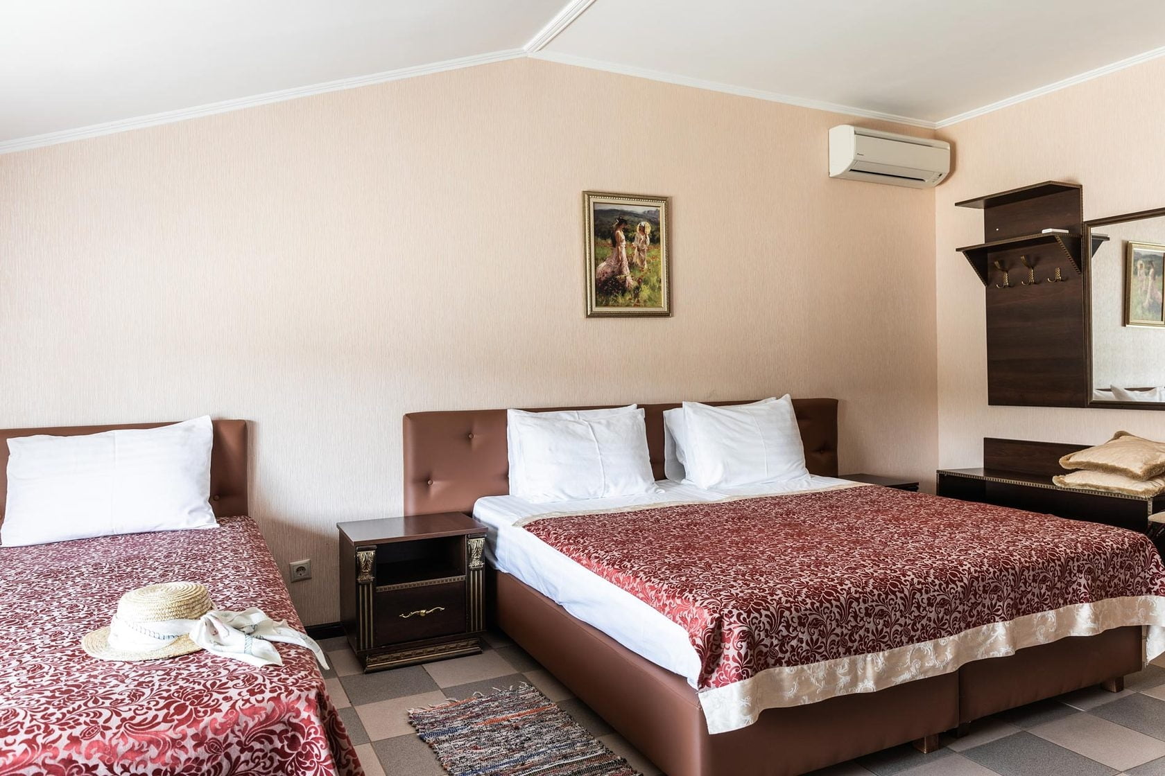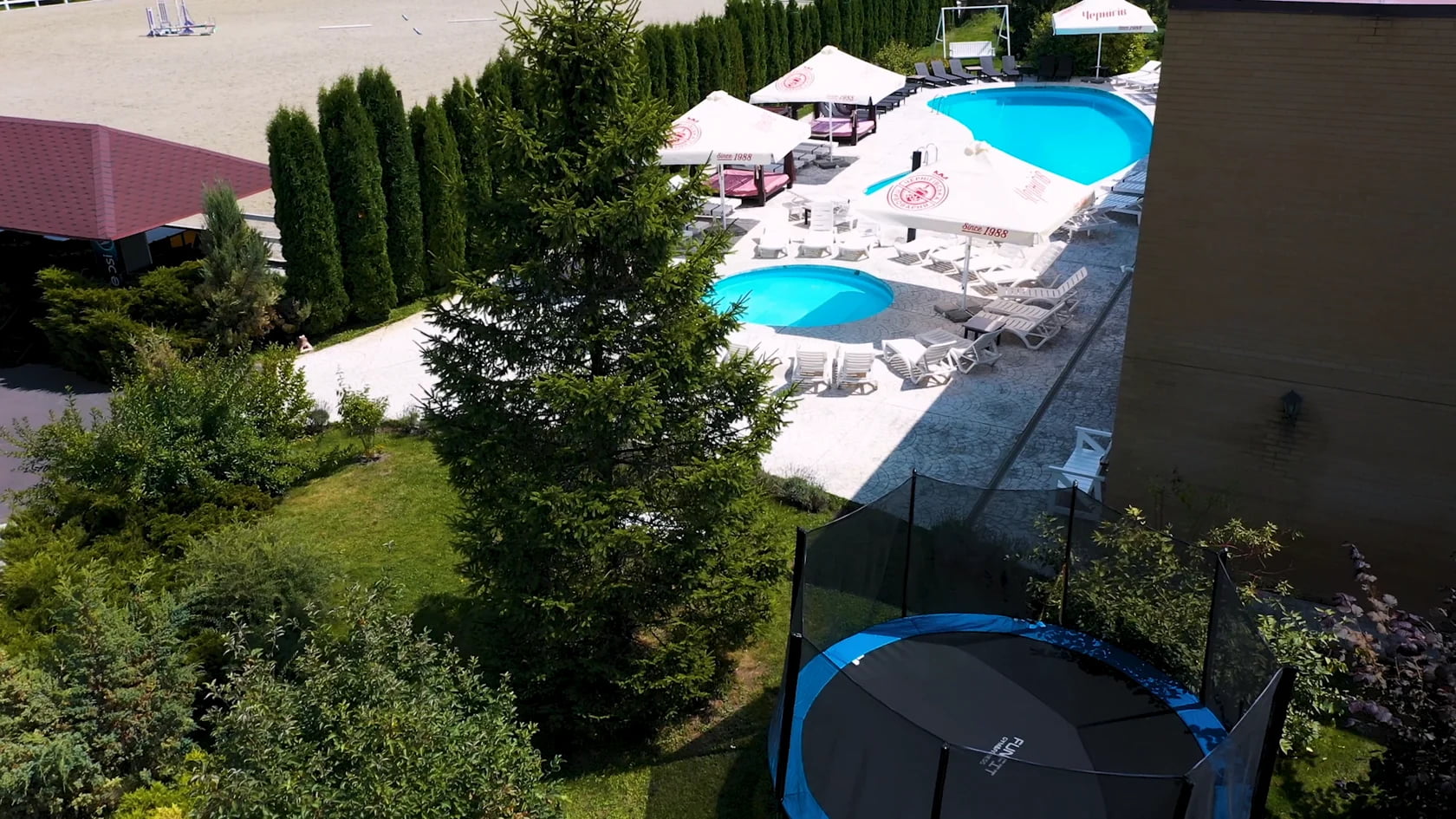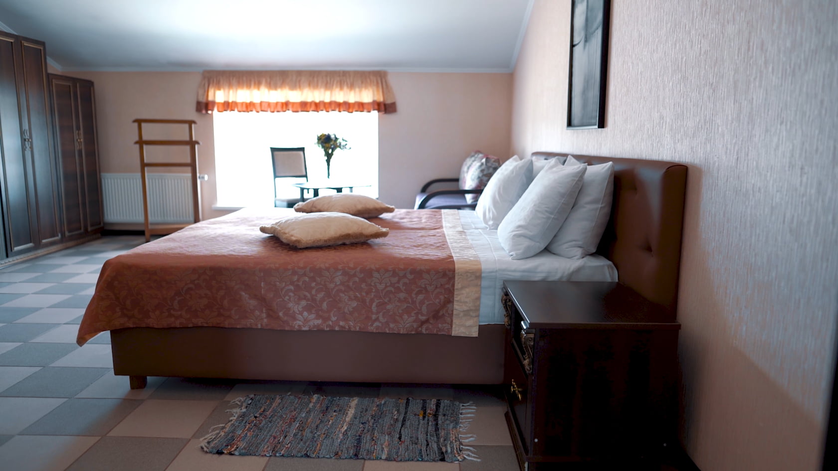 Комплекс пропонує комфортне розміщення у двох готелях з номерами різних категорій — від стандартних двомісних до просторих люксів із власним входом. Для компаній доступні дуплекси з сауною, а для сімейного відпочинку — затишні номери з балконом і видом на басейн. На території діє банний комплекс, безкоштовна парковка, дитячий табір і догляд за тваринами.