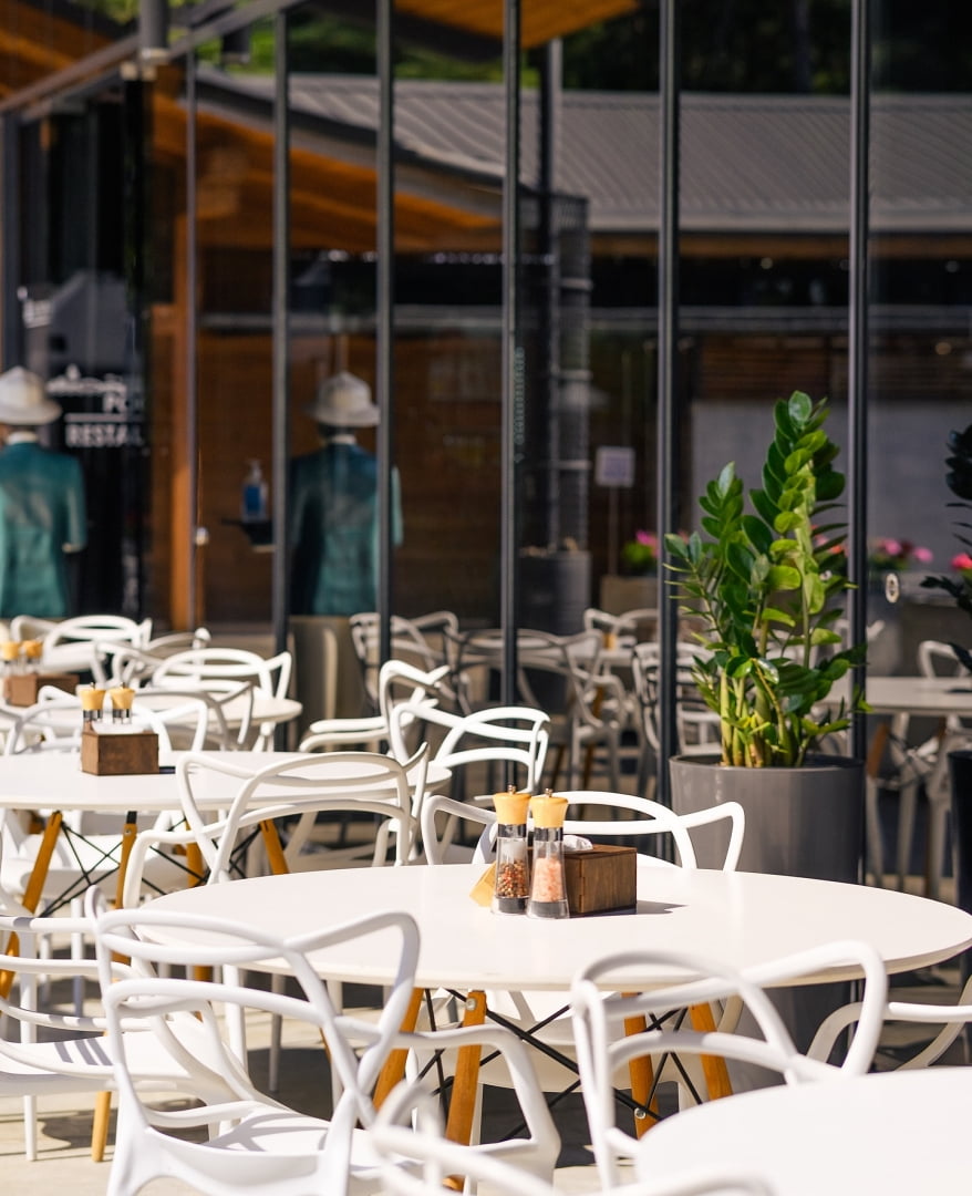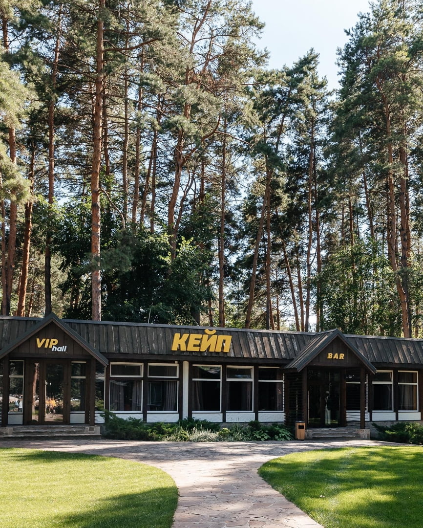 На території комплексу працює кілька закладів харчування. Ресторан «Кейп» пропонує страви української та європейської кухні. У літній сезон відкриваються пляжні та барні локації з легкими стравами, напоями та коктейлями. Для подій і свят доступні банкетні зали з видом на природу, які підходять для весіль, корпоративів і сімейних урочистостей. Частина форматів передбачає комплексне харчування для гостей, що проживають у комплексі.
