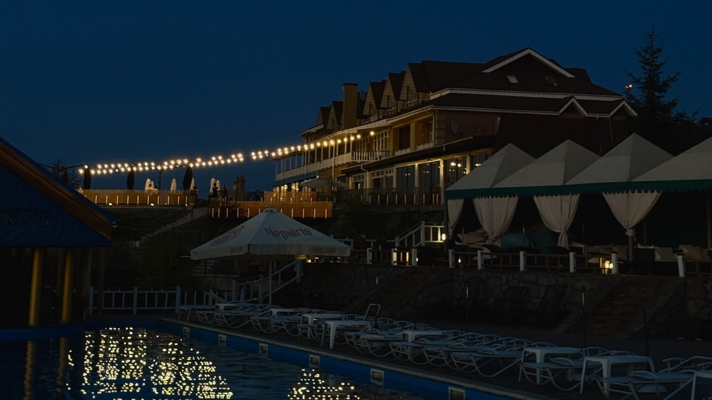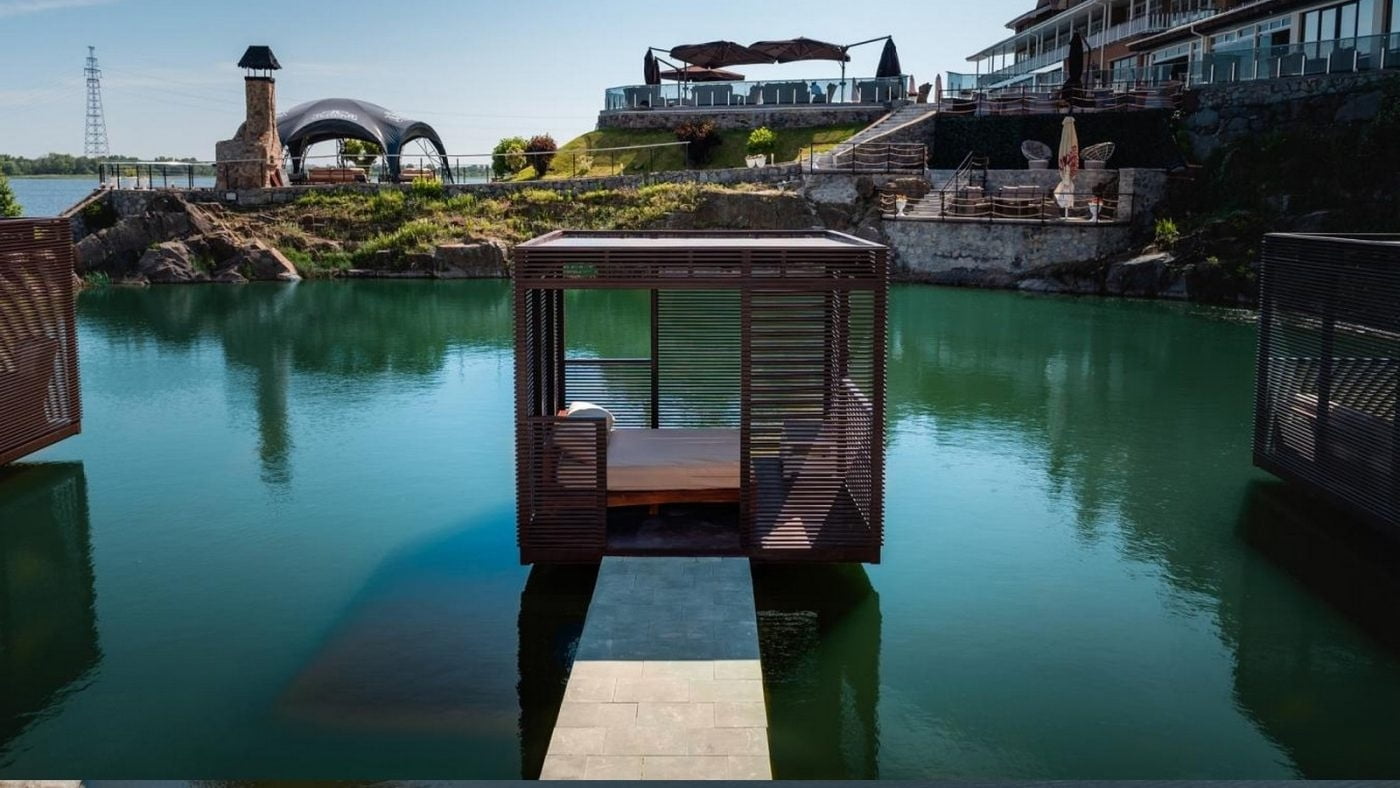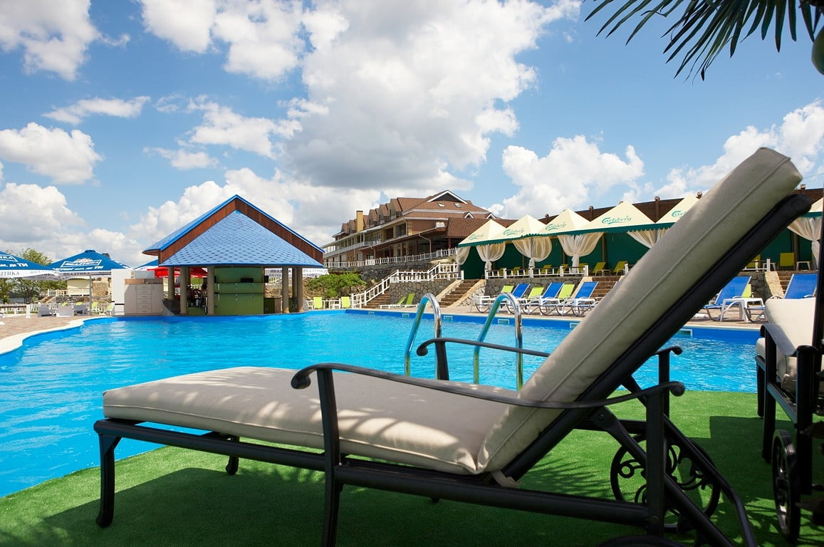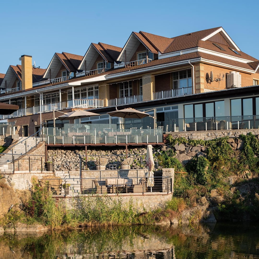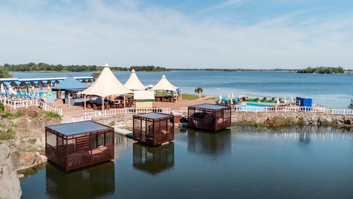 | Вартість відпочинку | (ціни на найпопулярніші категорії послуг в 2026 році) СПА-центр: Пн–Пт: дорослі – 1200 грн, діти 6–10 р. – 600 грн; Сб–Нд/свята: дорослі – 1400 грн, діти 6–10 р. – 700 грн; діти до 6 р. – безкоштовно. Аква-зона (Пн–Пт): дорослі – 500 грн, діти 6–9 р. – 250 грн, після 18:00: дорослі – 300 грн, діти – 150 грн; Аква-зона (Сб–Нд/свята): дорослі – 550 грн, діти 6–9 р. – 275 грн, після 18:00: дорослі – 350 грн, діти – 150 грн; діти до 6 р. – безкоштовно. Додаткові послуги аква-зони: бунгало на Дніпрі – 250 грн, диван (до 5 осіб) – 400 грн, м’яке ліжко – 300 грн, м’який шезлонг – 50 грн, мале бунгало на озері – 600 грн, велике бунгало на озері – 700 грн, Only Adult – 500 грн. Шале з джакузі: до 6 осіб – 2000 грн + 150 грн за кожного додаткового гостя. VIP-Zone (аква-зона): будні – 10 000 грн/доба, вихідні – 12 000 грн/доба; банька (аква-зона): 800 грн/год за 1 особу. Банька (готель): 800 грн за людину. Верхня тераса: дорослі – будні 850 грн, вихідні 950 грн; діти 6–9 р. – будні 425 грн, вихідні 475 грн; діти до 6 р. – безкоштовно. Only Adult (18+): 500 грн. Штрафи: порушення правил перебування – 1500 грн. |