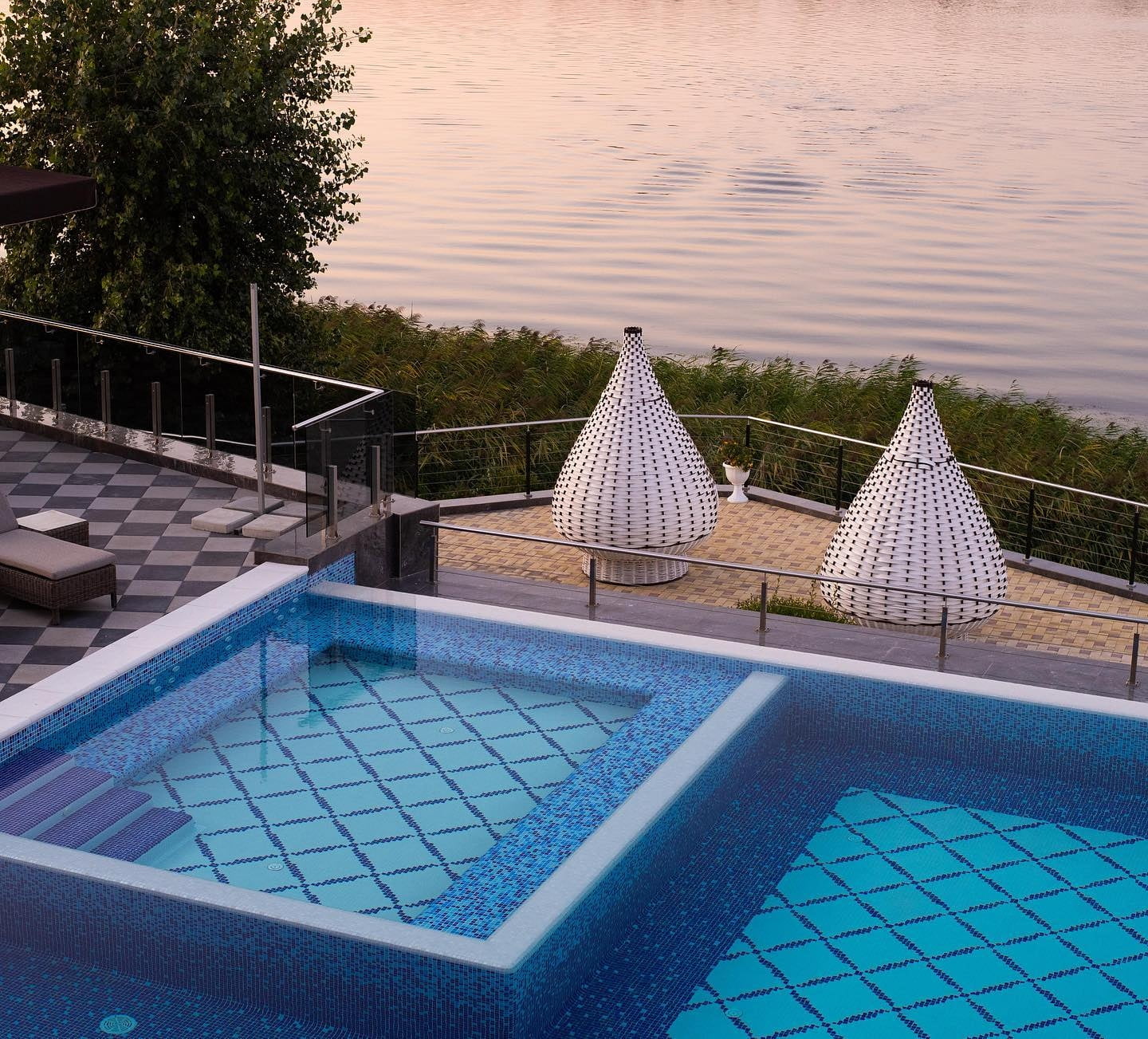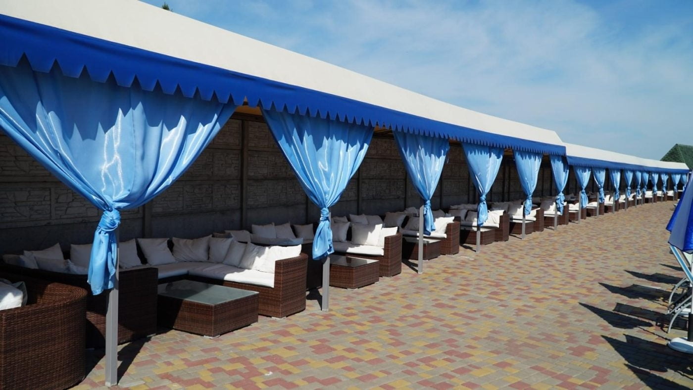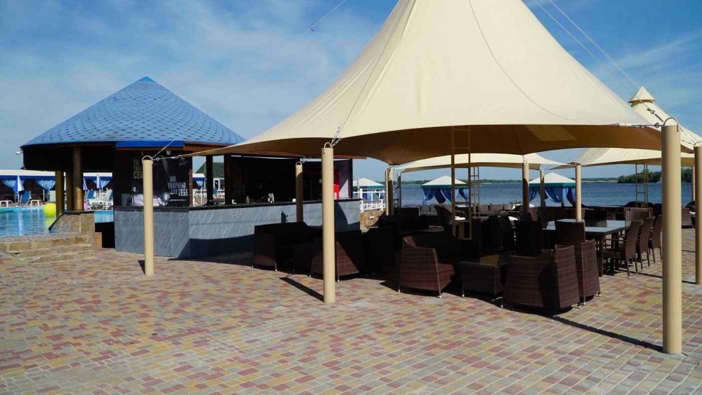 Для поціновувачів відпочинку просто неба облаштовано верхню терасу з двома відкритими басейнами з підігрівом, лаунж-зонами та панорамним видом на Дніпро. У теплий сезон функціонує аква-зона біля води з зонами спокійного релаксу.