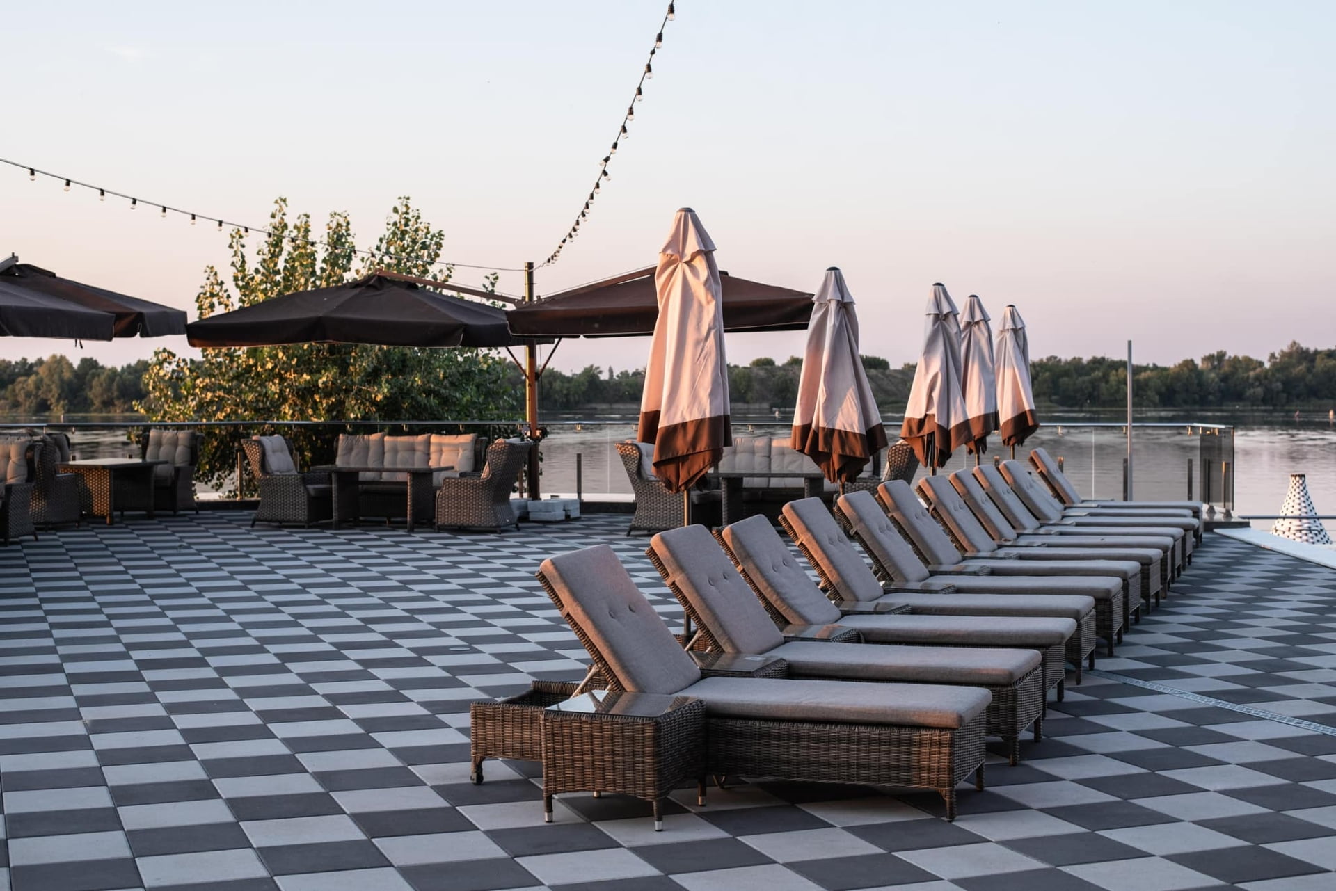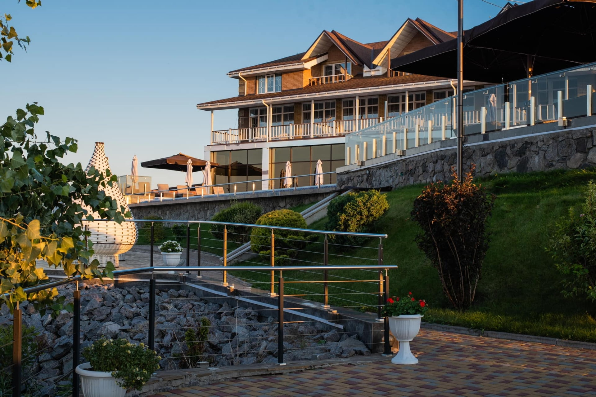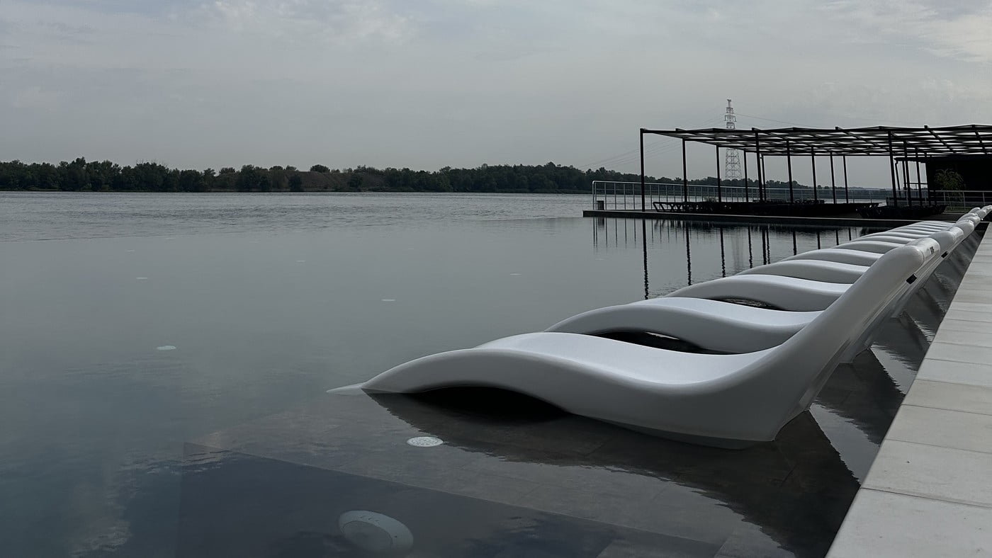Для поціновувачів відпочинку просто неба облаштовано верхню терасу з двома відкритими басейнами з підігрівом, лаунж-зонами та панорамним видом на Дніпро. У теплий сезон функціонує аква-зона біля води з зонами спокійного релаксу.