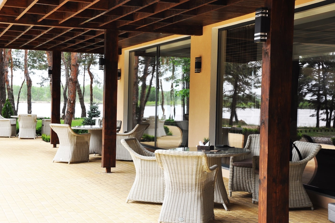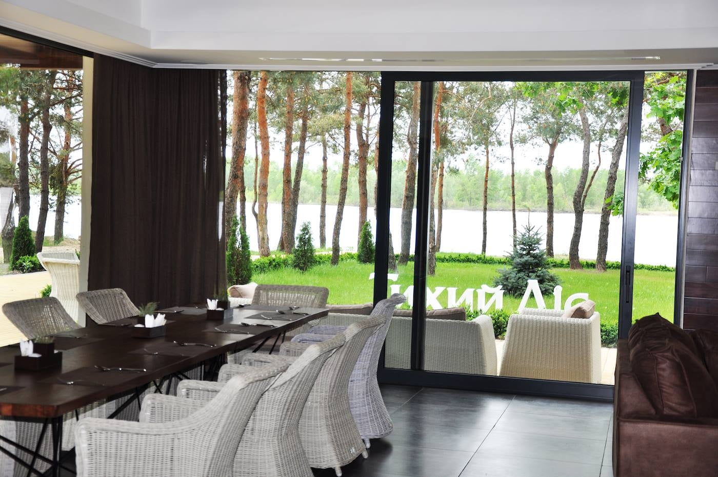 Ресторан має затишну залу з каміном і панорамним видом на Дніпро, а також пропонує обслуговування просто на терасі біля води. Тут можна не лише повечеряти, а й провести банкет, весілля чи корпоратив, скориставшись послугами професійної команди організаторів. Для тих, хто бажає усамітнення, передбачене замовлення їжі в номер або організація романтичної вечері просто під відкритим небом.